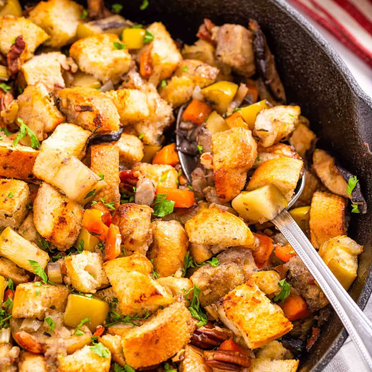 - Use the right skillet or pan: You can use a large cast iron skillet (like I did) or a regular skillet, and then transfer stuffing to an 8x11 baking dish.