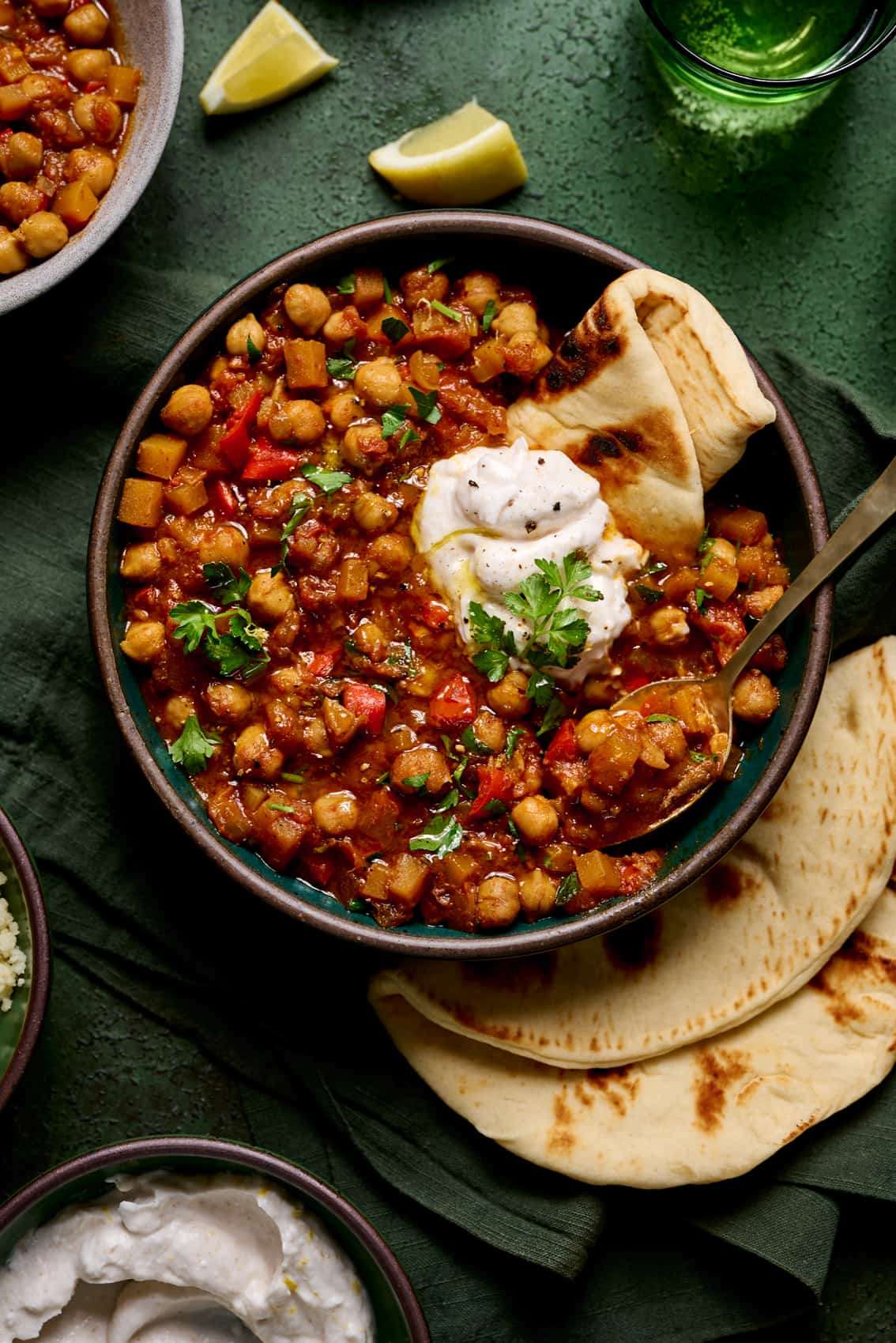 - Pour in some of the broth to deglaze the pot and scrape up any browned bits. Add the remaining broth, squash, chickpeas, bay leaves, salt, tomatoes, and dates. Stir, and bring to a boil. Turn off the heat, and drizzle with a nice glug of olive oil, and stir again to combine. Place the lid on the pan and ensure it’s fitted tightly.a. NOTE: If you don’t have a lid for your pan, cover tightly with foil.