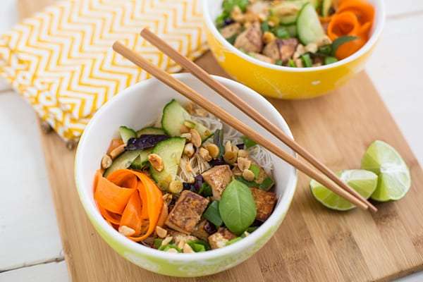 - Divide noodles, tofu, carrots, and basil into four bowls. Top with remaining ingredients, as desired. Ladle dressing into bowls and serve.