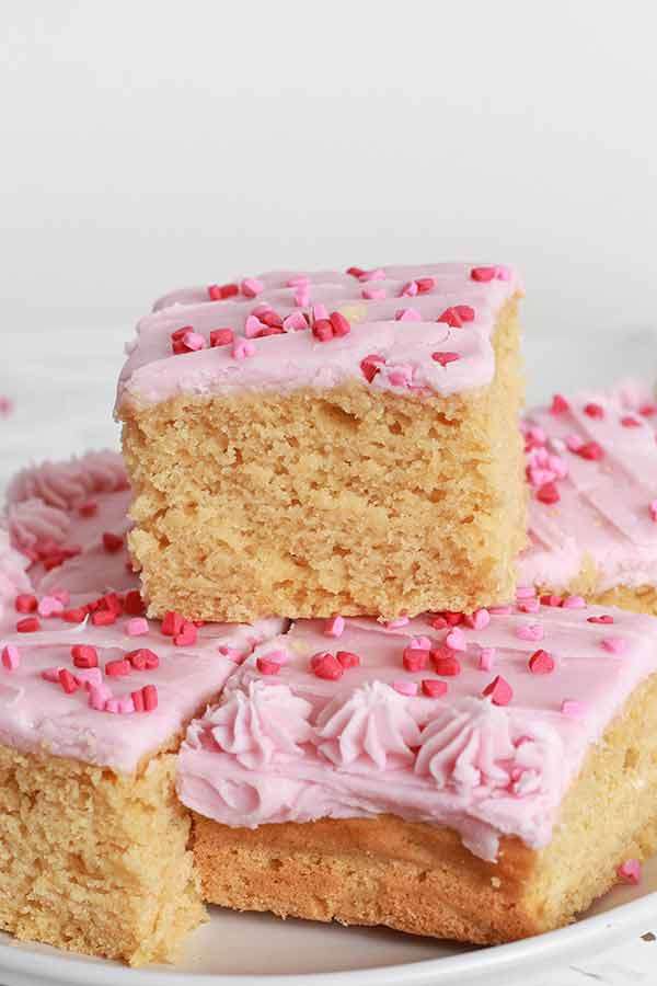 Vanilla flavoured vegan Valentine's traybake cake with strawberry frosting.