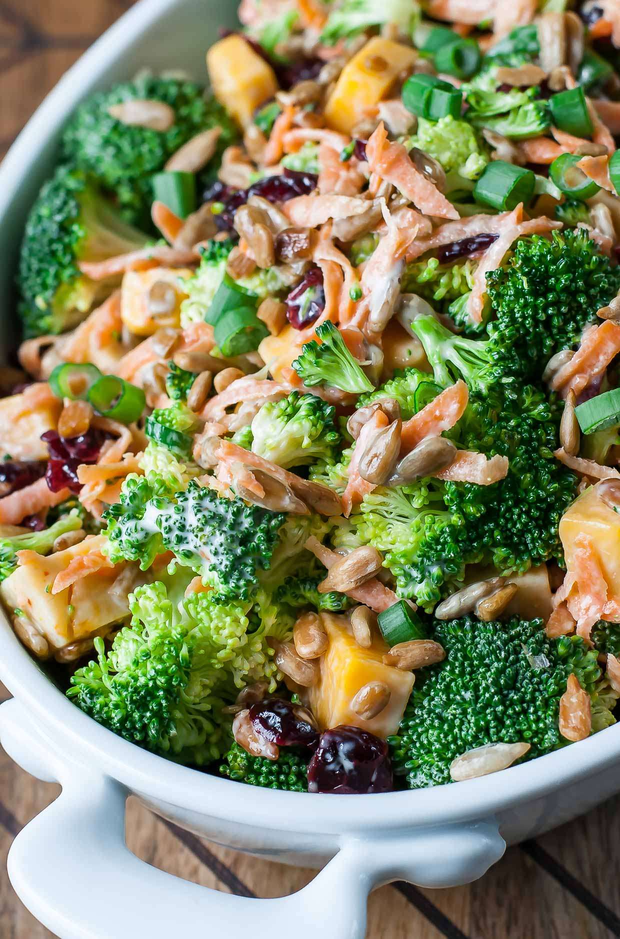 This tasty Vegetarian Broccoli Salad features cranberries, carrots, cheddar cheese, sunflower seeds, and a tasty lightened-up homemade dressing.