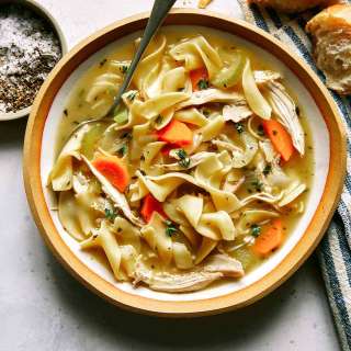 - Add broth and bring to a boil. Once the mixture is boiling, add egg noodles and simmer for 8 minutes. (The noodles will be slightly undercooked, but don't worry--they'll continue cooking after removed from heat. This way, the noodles won't be mushy.)
