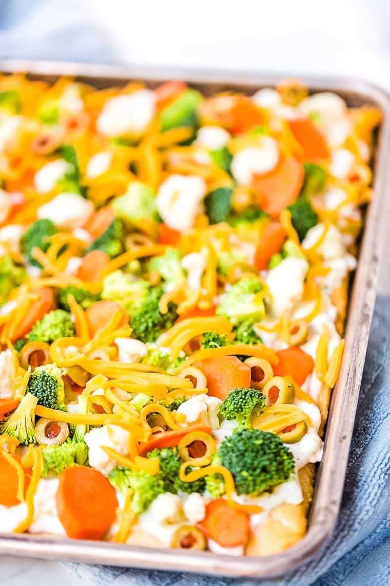 This vegetable pizza starts with a flaky crescent roll crust and is topped with creamy ranch cream cheese and your favorite vegetables like carrots, broccoli, cauliflower, olives and cheese!