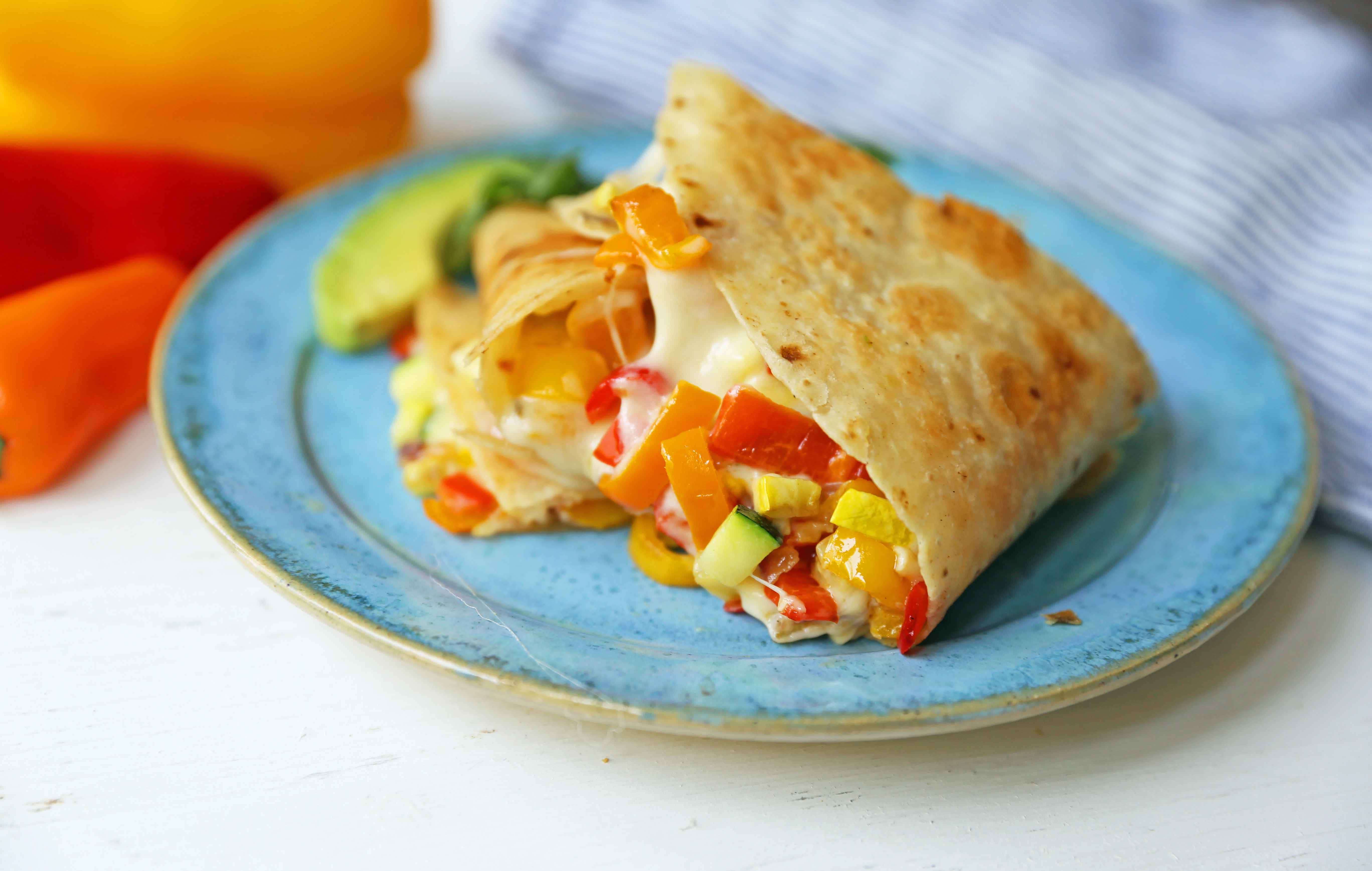 Summer veggies with ooey gooey melted cheese in a golden buttery tortilla.