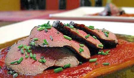 - To serve, pour some sauce down on a plate, then top with the red peppers. Slice the tenderloin and arrange it on the red pepper. Garnish with chopped chives.