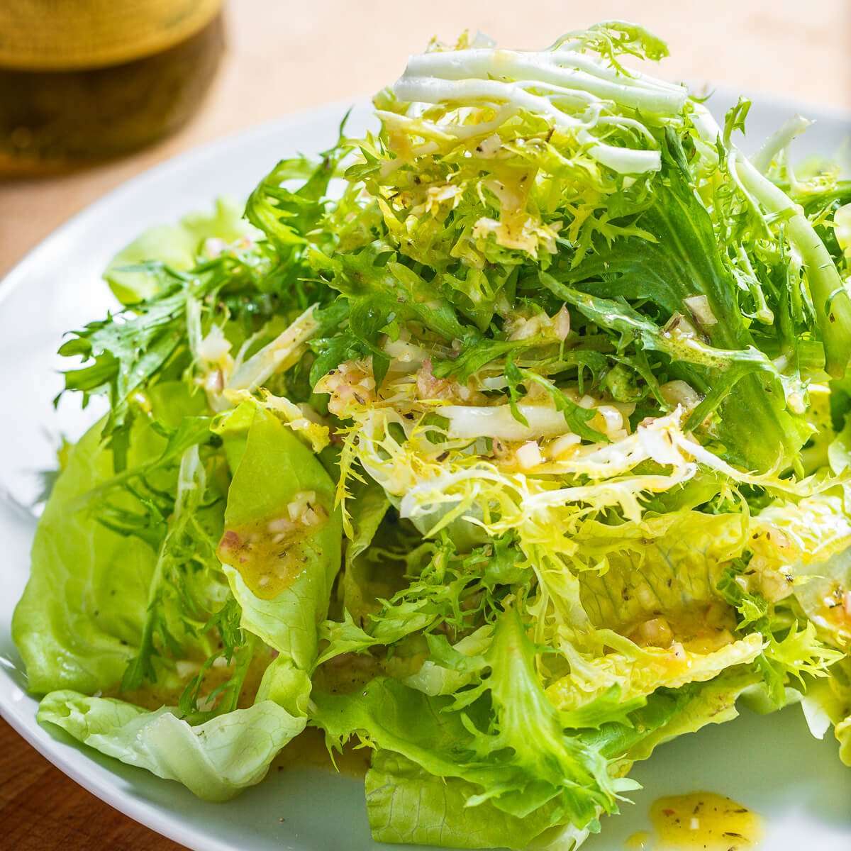 Romaine, frisee, and butter lettuces are dressed with a sherry shallot vinaigrette in this salad inspired by NYC's Via Carota.