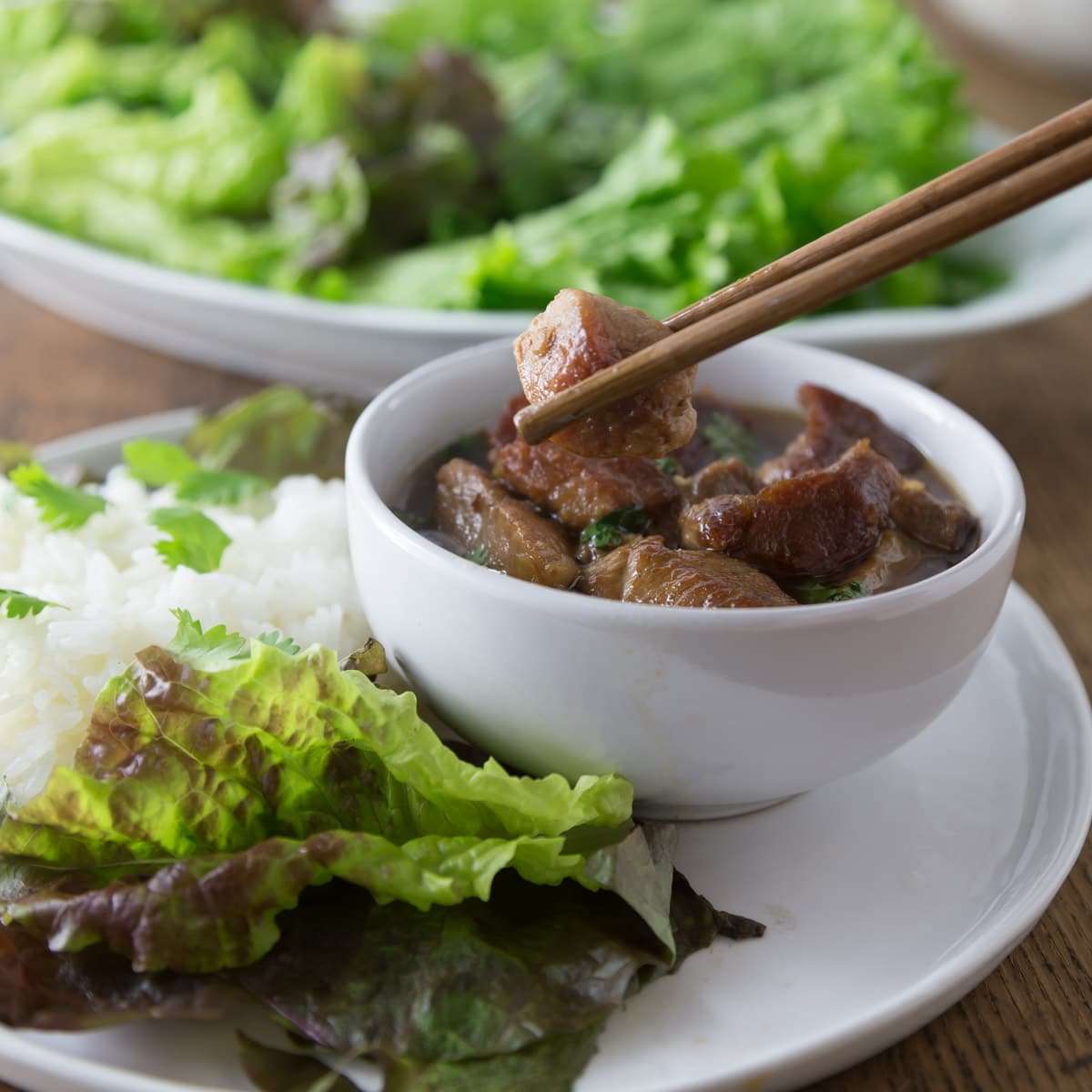 Traditional Vietnamese Thit Kho Tau, braised pork in coconut sauce. Tender and delicious in a light sauce.
