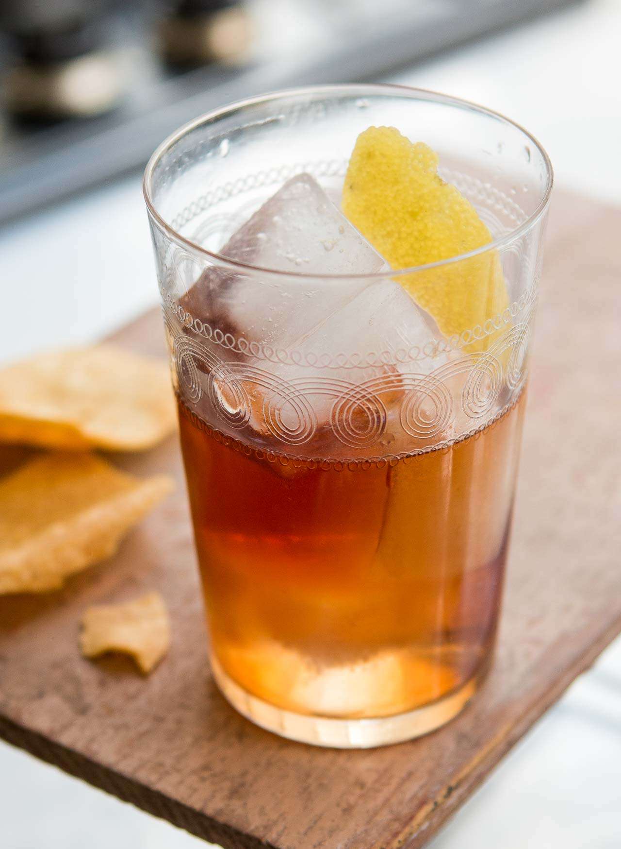 - Pour the whiskey into a cocktail mixing glass along with the Cognac, vermouth, and bitters. Fill with ice cubes and stir until well-chilled, then strain into an ice-filled cocktail tumbler. Garnish with a twist of lemon or perhaps a candied cherry – or both. You can also serve it up, without pouring it over ice, if that’s your thing. Because you’re an adult, which means that you can do whatever you want. (And if you’re not an adult, you shouldn’t be drinking cocktails in the first place.)