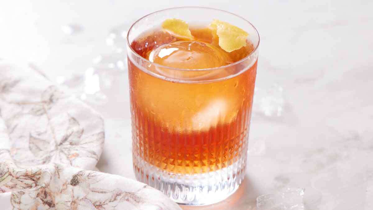 - Strain the drink into a rocks or old-fashioned glass filled with fresh ice. Garnish with a lemon twist or a cherry.