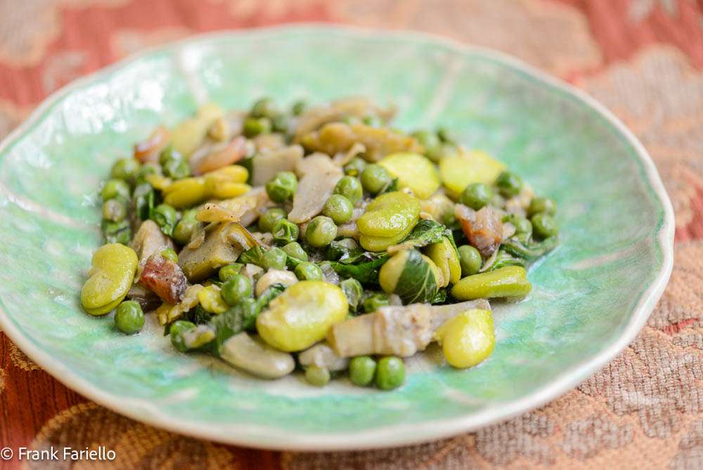 - Begin by prepping all your vegetables. Trim and cut the artichoke into thin wedges, following the instructions in this post. Immerse the wedges in acidulated water until needed. If using fresh fava beans in their pods, remove them from their pods and peel off their skins (see Notes for details). If using fresh peas, remove them from their pods as well. Cut and shred your lettuce. Trim the green tops off the spring onions and slice the white bulbs thinly.