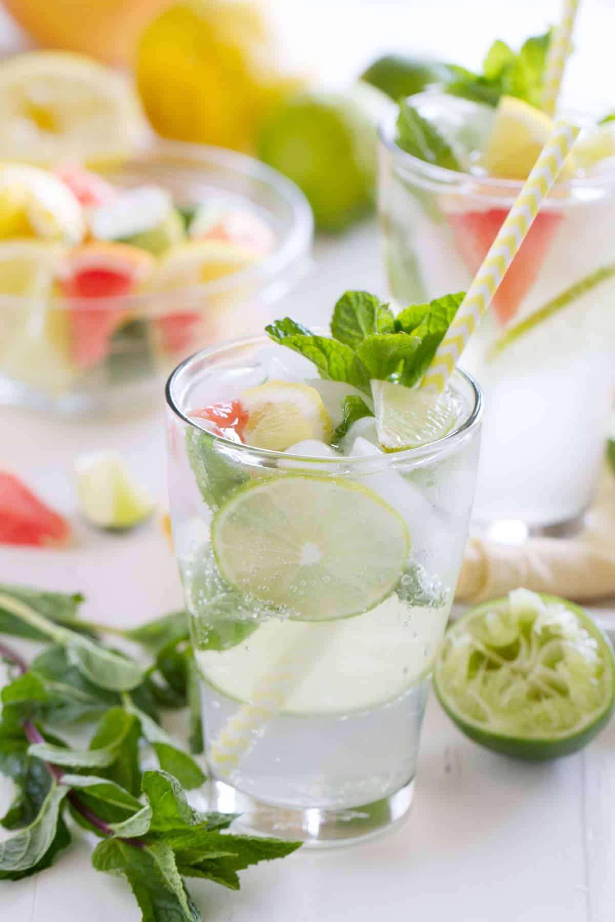 - Add a couple handfuls of ice to each glass, then top off with club soda. Mix, taste and add more simple syrup if it’s not sweet enough for you. Serve topped with lime, lemon and/or grapefruit wedges.