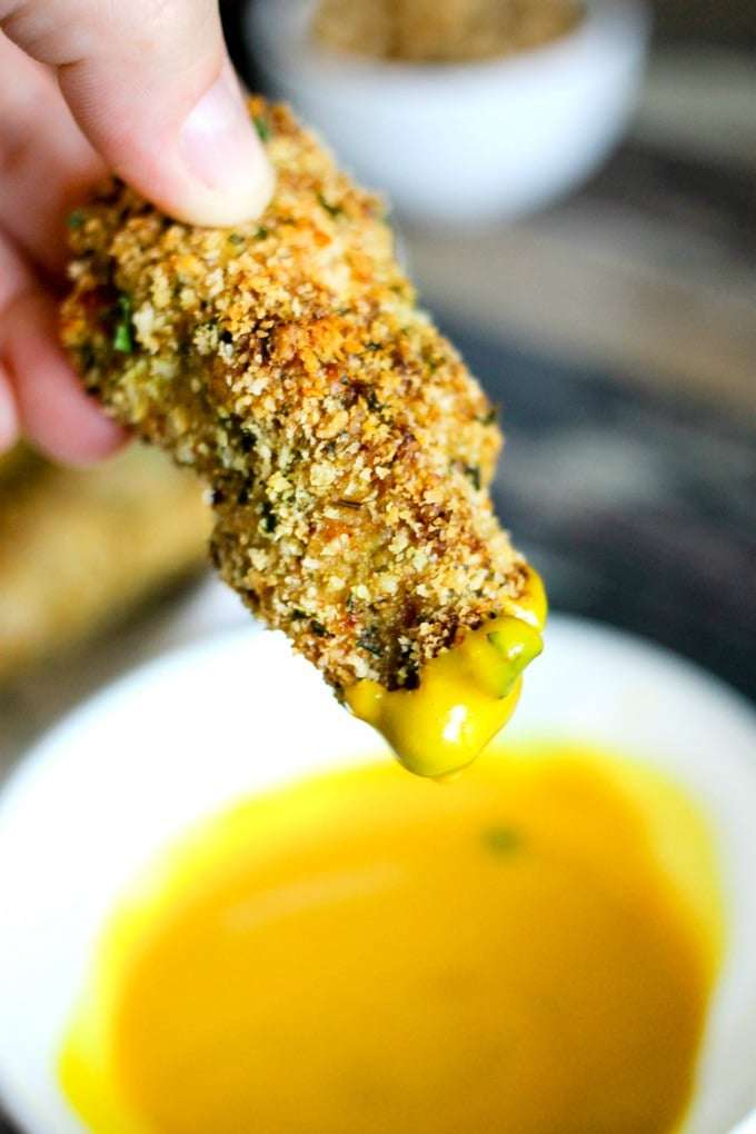 Walnut Honey Mustard Chicken Strips - juicy chicken breast coasted in honey mustard and a crispy walnut panko! This recipe is easy and delicious!