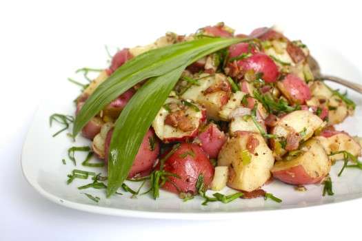- In a large mixing bowl, combine boiled potatoes, bacon and onions, and warm vinaigrette.