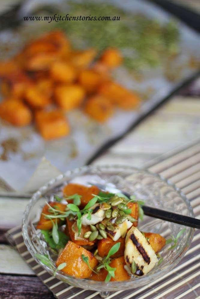 - When the pumpkin is tender, remove from the oven and cool slightly. Toss 1/2 the seeds, herbs and cheese with half the dressing the very gently mix with the pumpkin. Put onto a plate or platter and sprinkle with the remaining dressing, seeds and some black pepper.