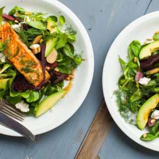 Warm Salmon and Spinach Salad with Roasted Beets, Avocado and Feta