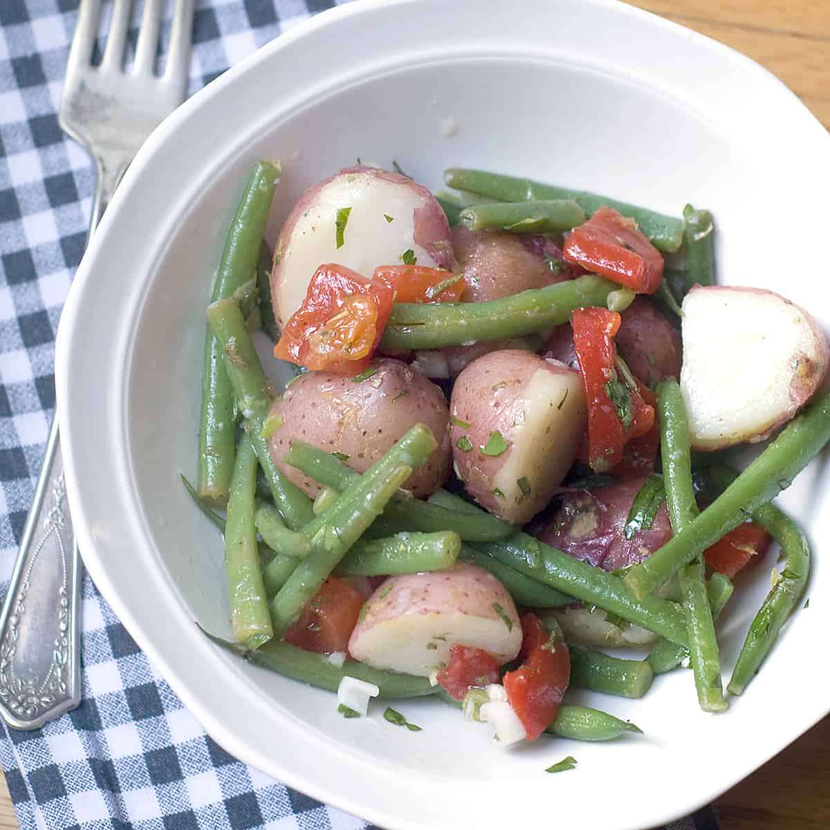 Warm new potatoes and green beans tossed with a lemon-garlic dressing.