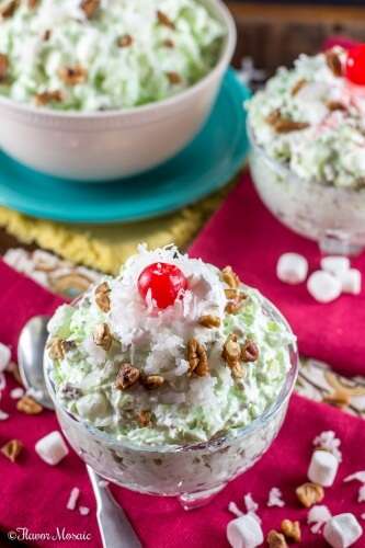 This Watergate Salad, also known as Pistachio Salad, Pistachio Delight or Pistachio Fluff or Green Fluff, is a sweet, cool, crunchy dessert made with pistachio pudding, whipped topping, crushed pineapple, mini marshmallows, pecans and coconut.