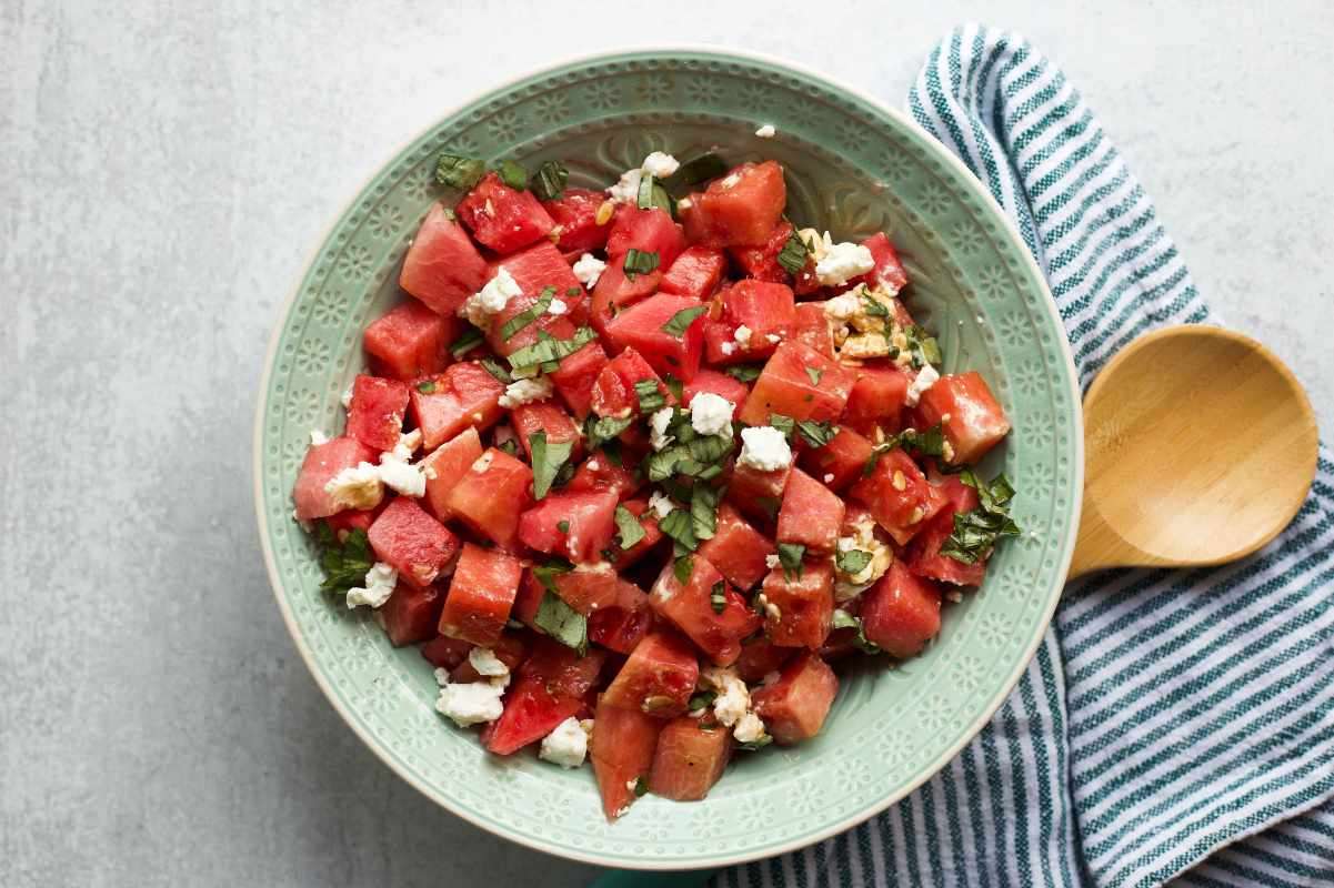 - Use clean hands or a knife to crumble all but one tablespoon of the goat cheese into small pieces all over the top of the watermelon. Set that remaining tablespoon aside for serving the salad.