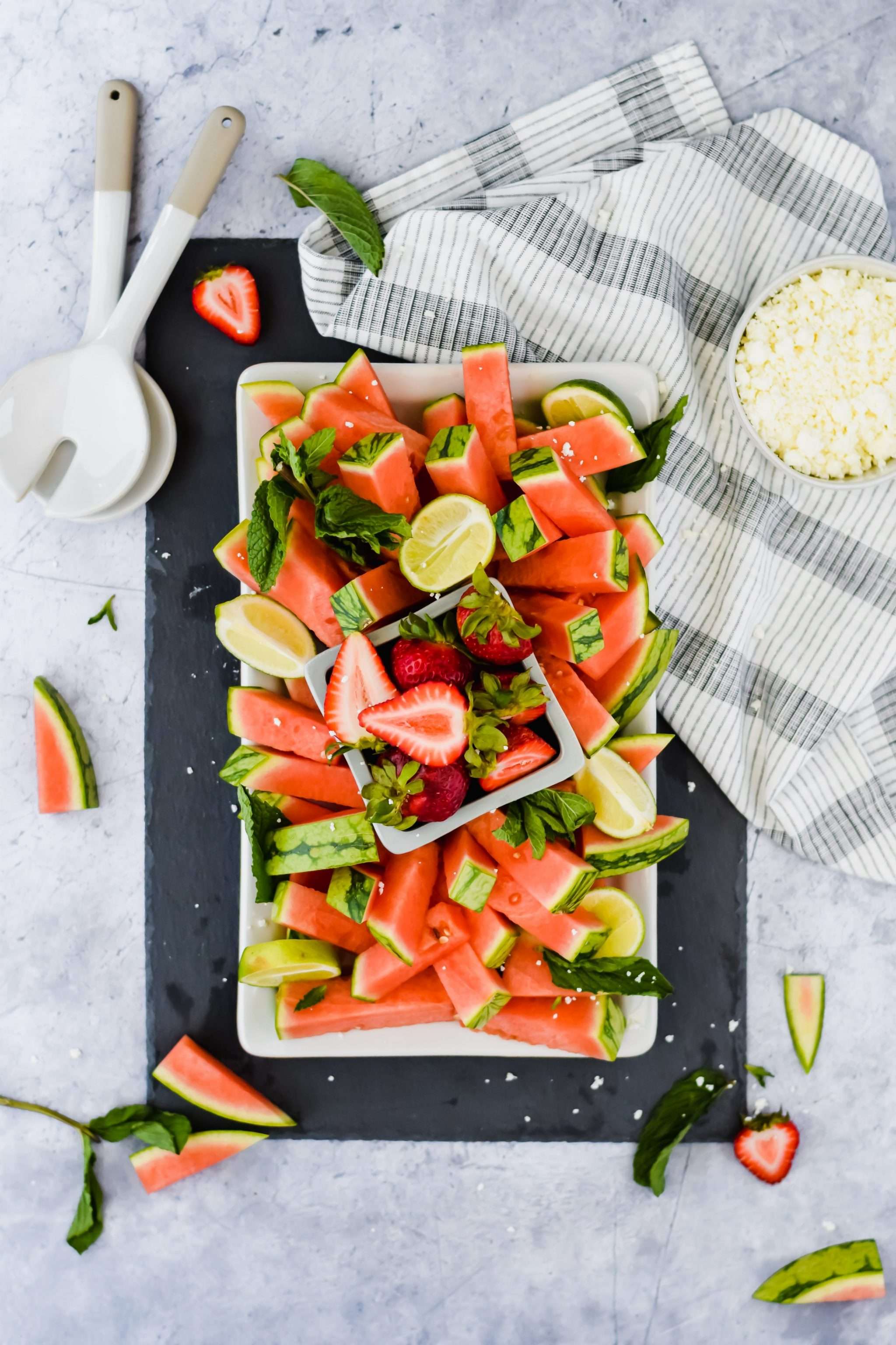 - In a serving bowl, combine watermelon cubes, strawberries, crumbled feta, and mint leaves. Toss gently.