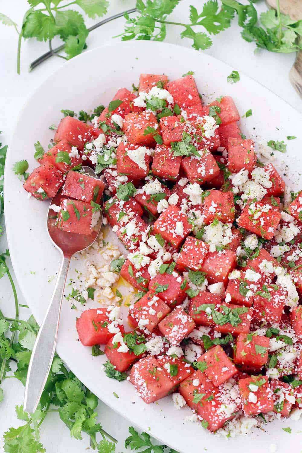 This refreshing watermelon salad with queso fresco, lime, and cilantro is the perfect balance of sweet and salty! It's easy to make this vegetarian side dish in advance and perfect for your summer festivities.