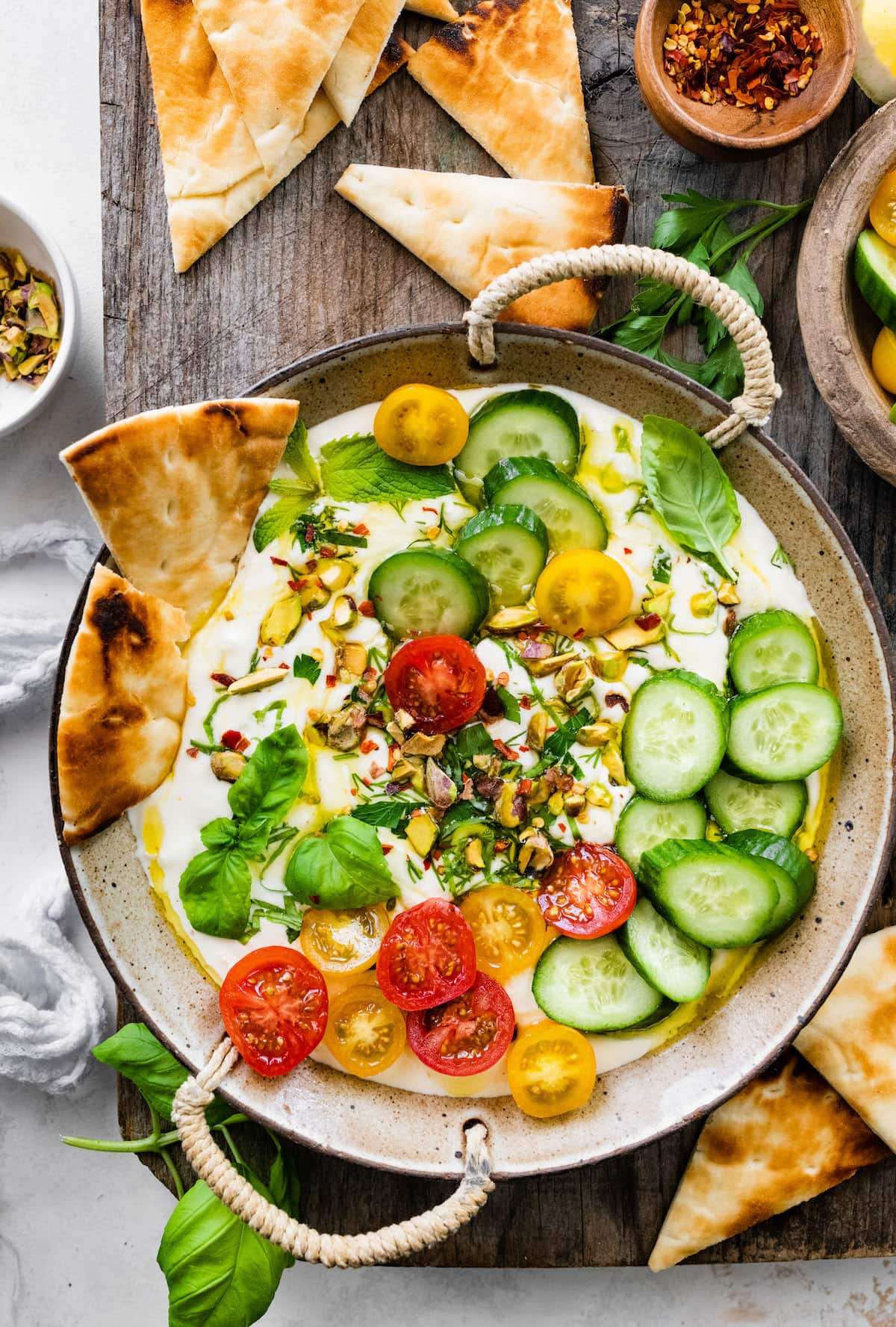 - Spread the whipped feta in a shallow bowl or onto a small plate. Drizzle with a little olive oil. Garnish with fresh herbs, crushed red pepper flakes, and chopped pistachios. Serve with cucumbers, tomatoes, and bread.