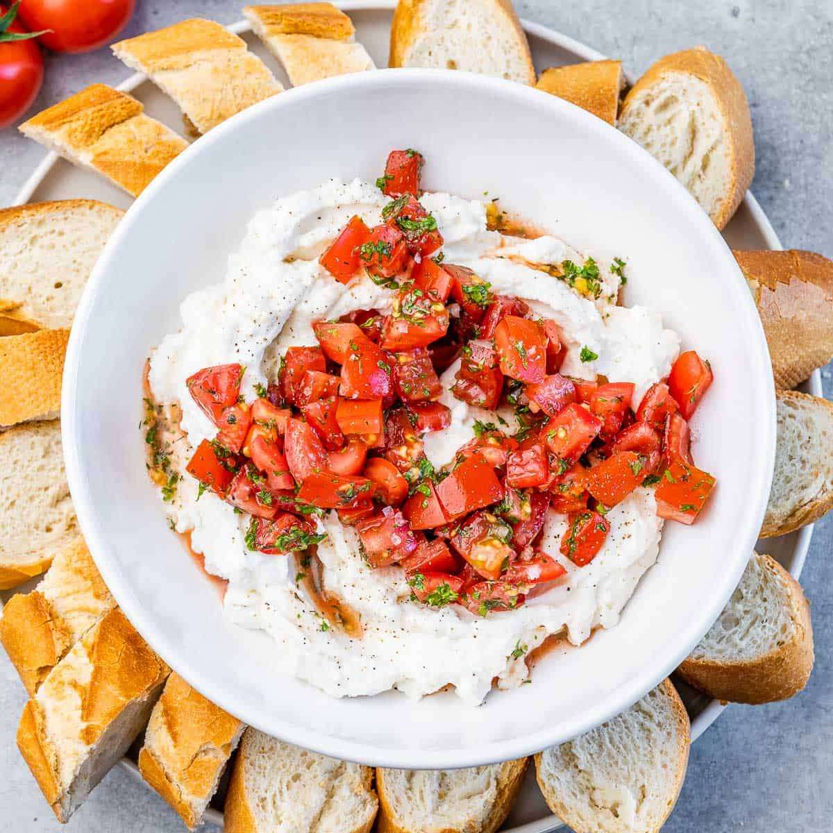 - Top the whipped ricotta dip with the chopped tomato salsa and serve with crusty baguette.
