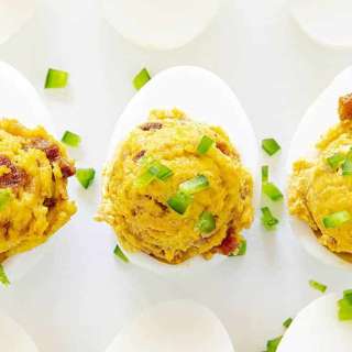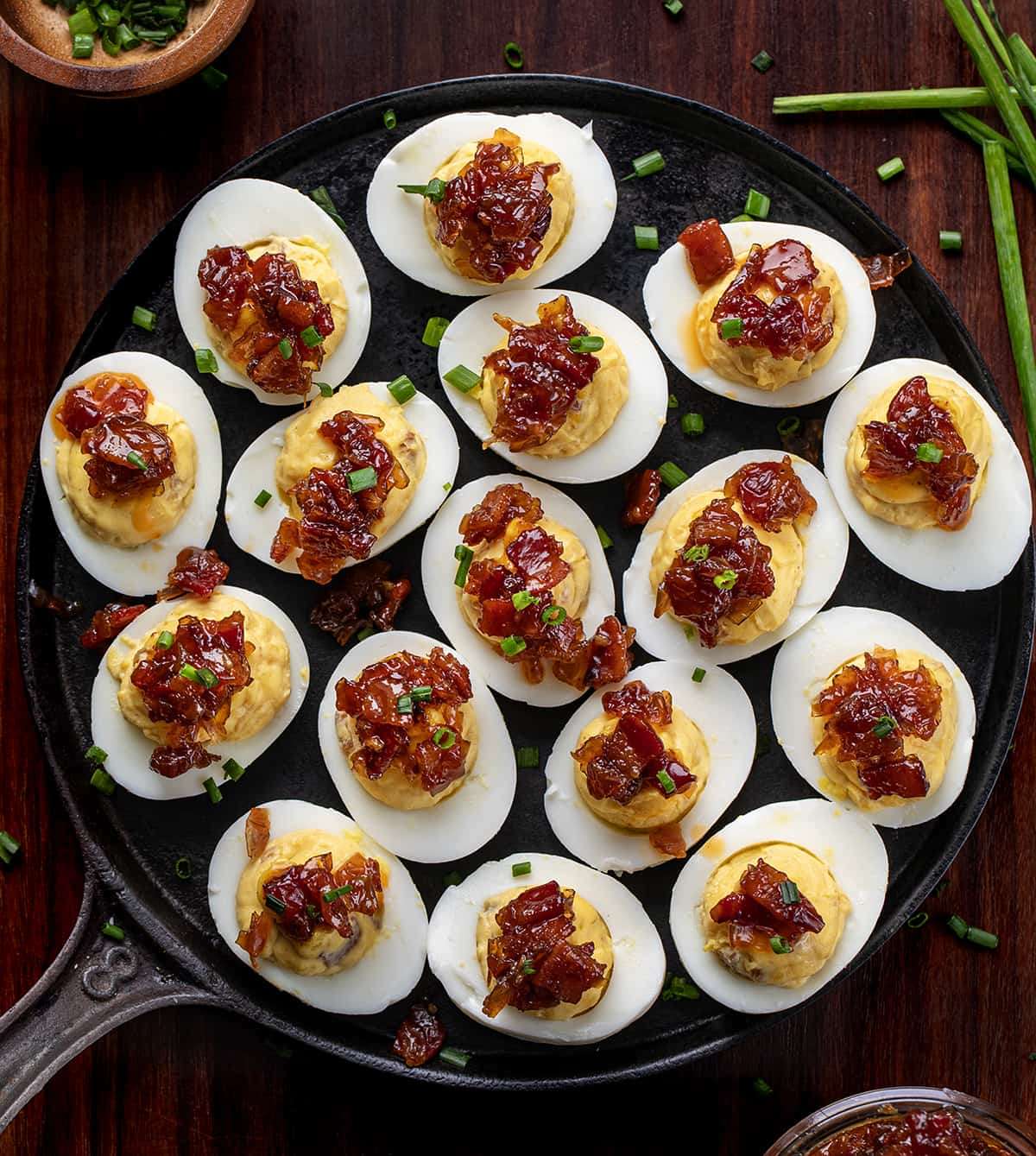 These unique Deviled Eggs are a delicious twist on the classic appetizer made with the richness of homemade whiskey bacon jam complementing the egg yolk mixture. They are sure to be a hit at any gathering or a special treat for yourself!