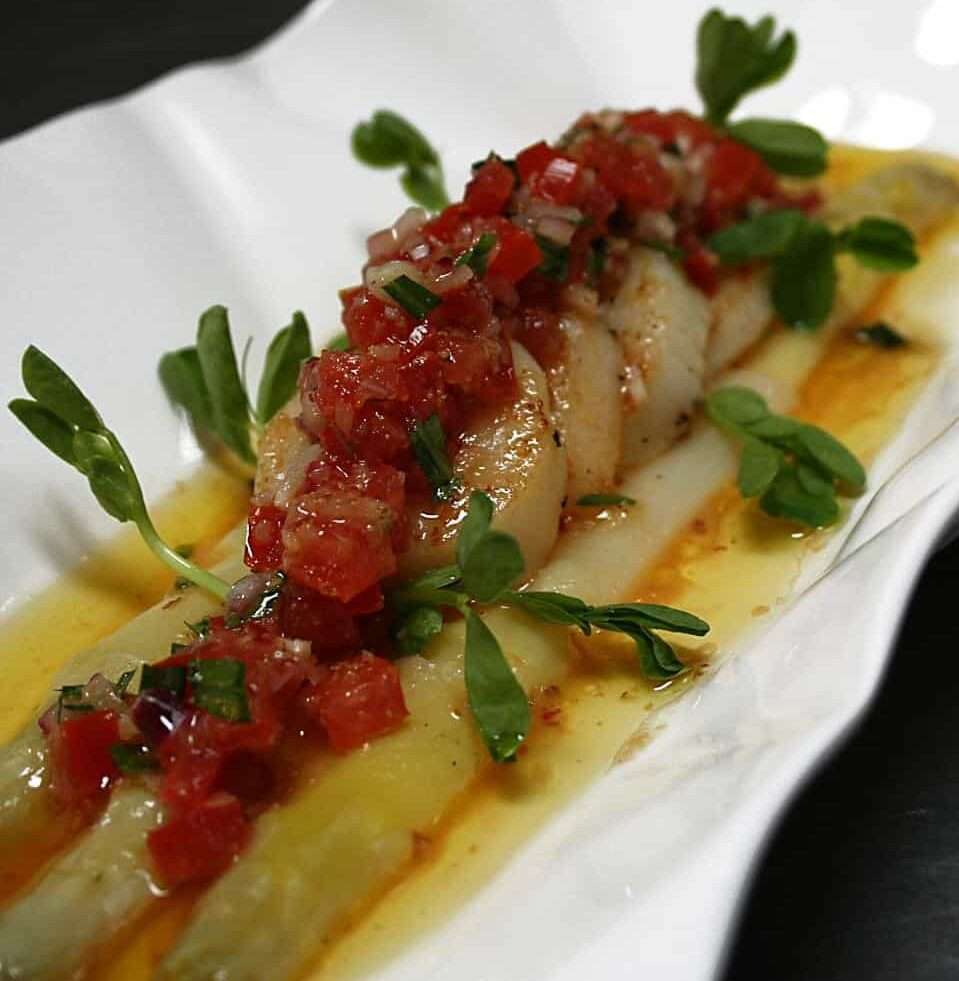 White Asparagus & Seared Scallops in Tomato-Tarragon Vinaigrette