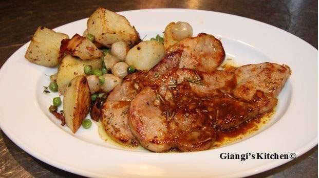 White Balsamic Pork Chops with Roasted Potatoes and Peas