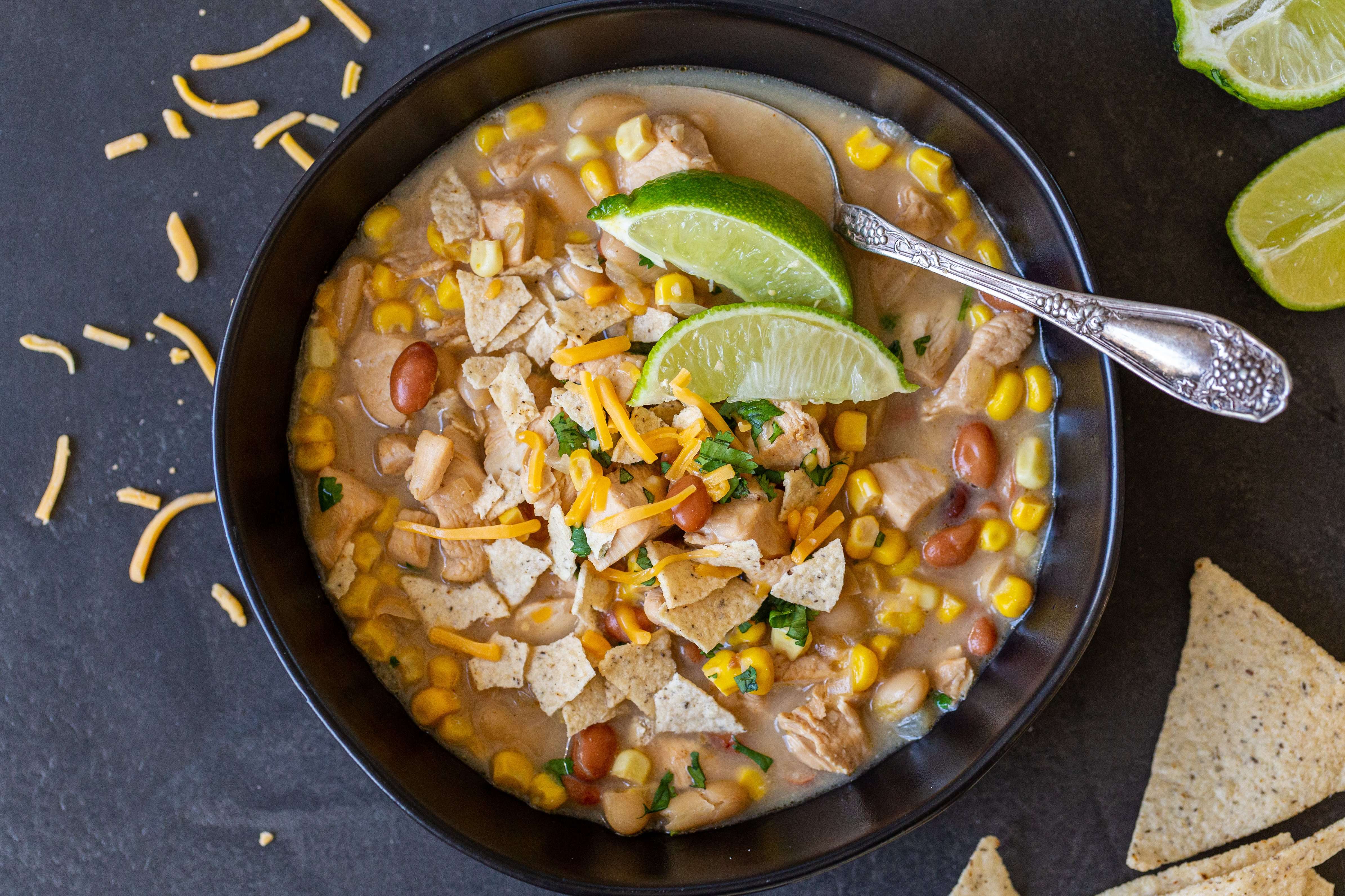 This white chicken chili is comfort in a bowl. Juicy chicken, protein-packed beans, and sweet corn make for a meal both filling and delicious!
