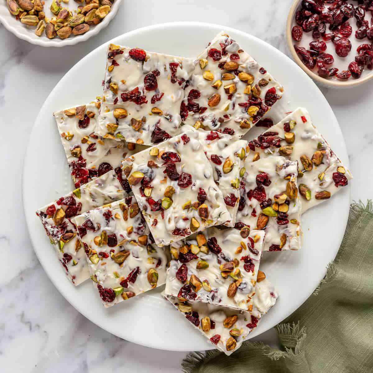 My favorite White Chocolate Bark with pistachios and dried cranberries! It's the trifecta of all the things, sweet, salty, chewy, crunchy... soo good!