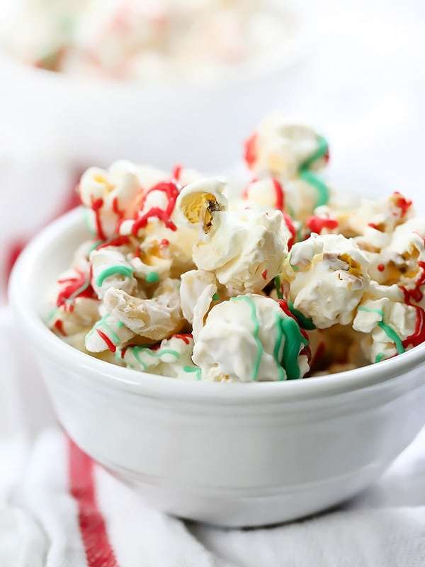 - Once the popcorn is completely dry, use a fork to scoop a bit of the red chocolate and drizzle it over the popcorn n streaks. Let the chocolate dry and then repeat with the green chocolate. Allow chocolate to dry between colors.