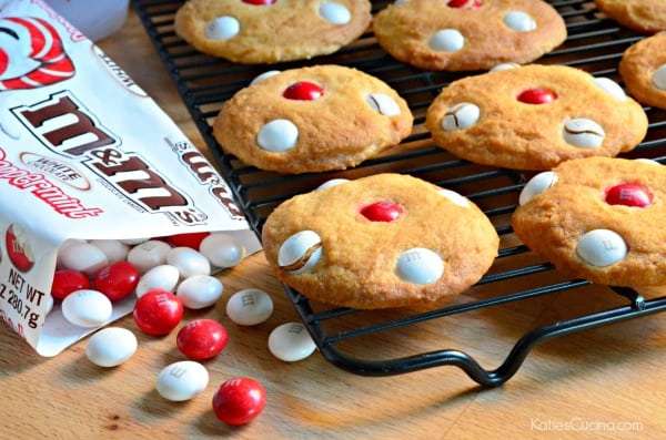 - In a stand mixer, prepare sugar cookie mix according to package (drop cookie method). Using a medium-size cookie scoop, scoop dough on to a cookie sheet. Then place 5 White Chocolate Peppermint M&M's® in the dough.