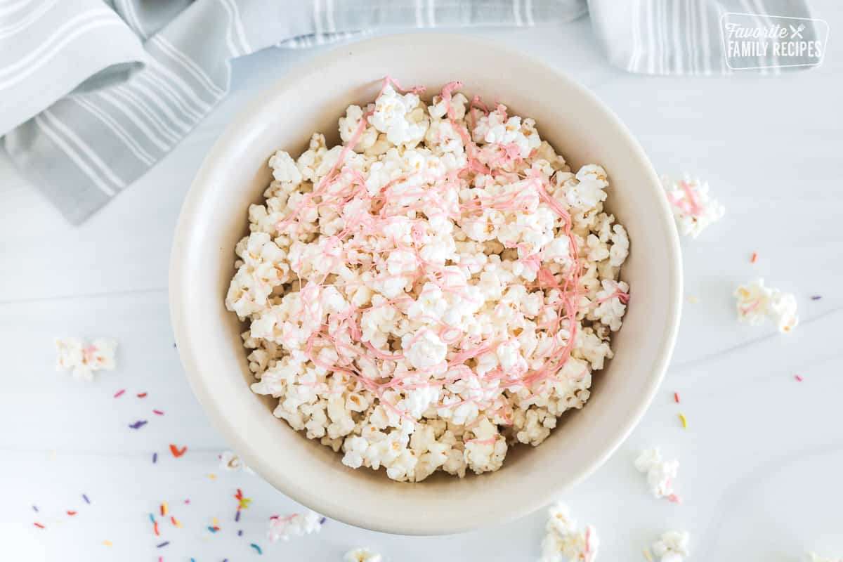 - Add all 24 ounces of white candy melts to the popped popcorn.
