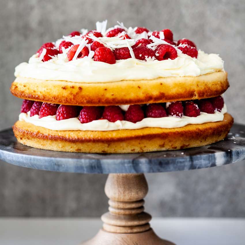 - Top with the remaining layer of cake and finish with the rest of the whipped cream and raspberries.