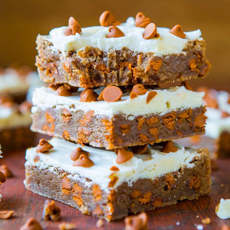 These soft, tender, and moist bars are robustly flavored with cinnamon. One hearty tablespoon is stirred into the batter, along with cinnamon chips that both line the interior of the bars, and are sprinkled on top. If you can’t fine cinnamon chips, there’s really no substitute in this recipe and I recommend ordering them. If you prefer less intensity of cinnamon flavor, dial down the amount added to the batter. The white chocolate topping adds a sweet pop to counter the spiciness of the cinnamon. Read the blog post for tips when selecting white chocolate, as it’s notoriously difficult to melt and prone to scorching. These fast and easy bars are ready in 30 minutes and are perfect for fall and winter baking.
