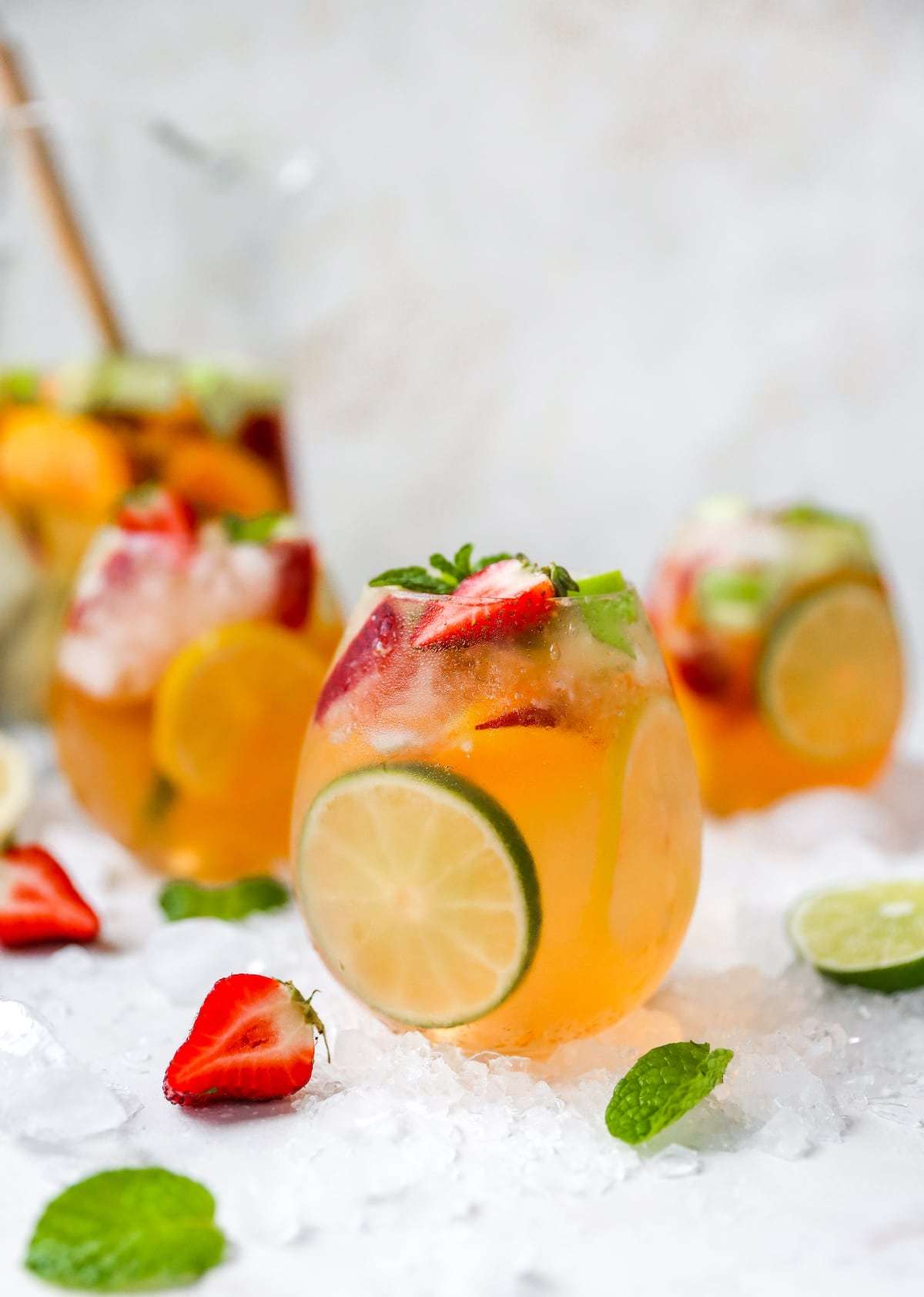 - To serve, stir the sangria and pour over a glass of ice and/or frozen berries. Top with sparkling water and garnish with fresh mint and strawberries, if desired.