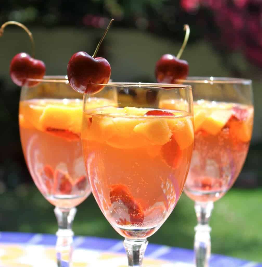 - In a sangria jug, place the macerated fruit, the remaining white wine, and the lemon lime soda. Stir gently (the cherries will give the sangria/spritzer a lovely pink tint).
