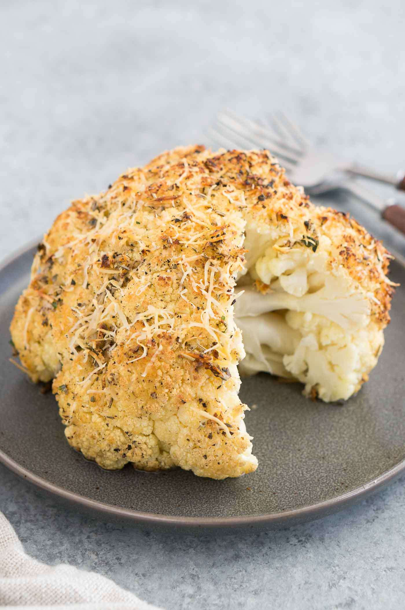 Whether you serve it as a side dish or a meat-free main dish, this whole roasted cauliflower is so delicious! Seasoned with parmesan cheese, garlic and herbs, this simple recipe packs a punch of flavor.