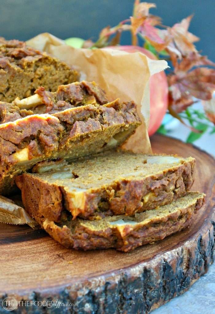 Pumpkin apple bread with coconut oil and half the sugar of traditional recipes! This delicious pumpkin bread is a tasty breakfast or snack. These can also be made into muffins.