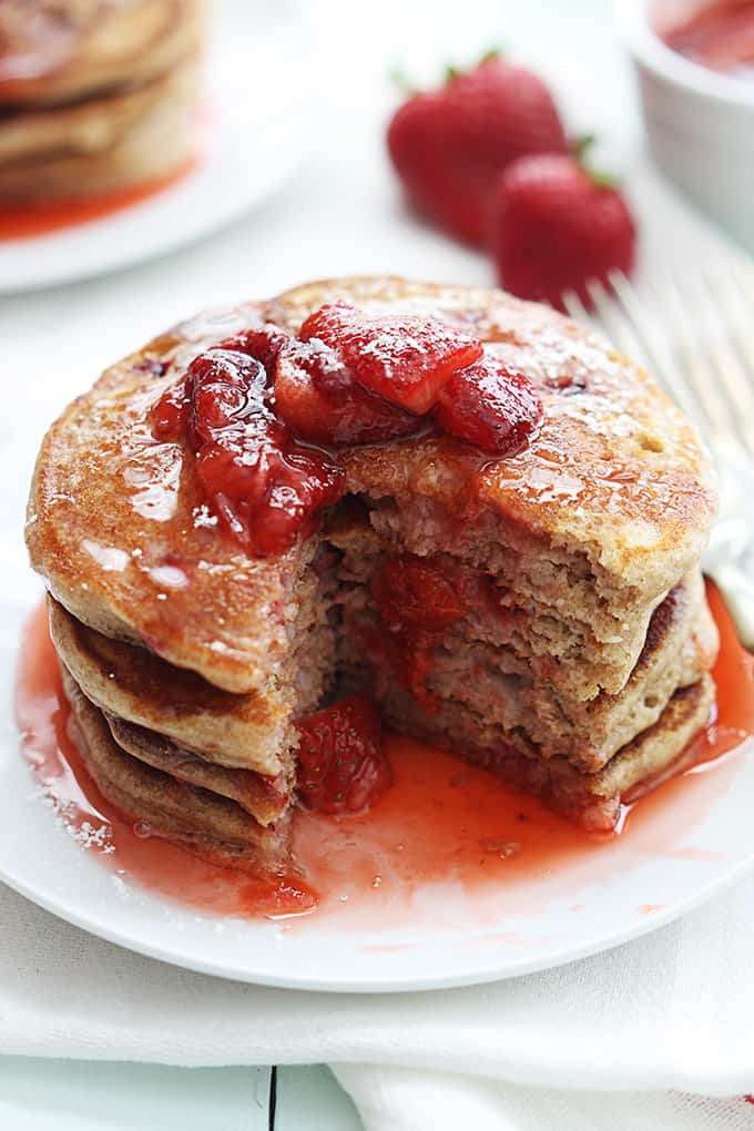 Soft and fluffy strawberry whole wheat pancakes - a healthy AND delicious breakfast!