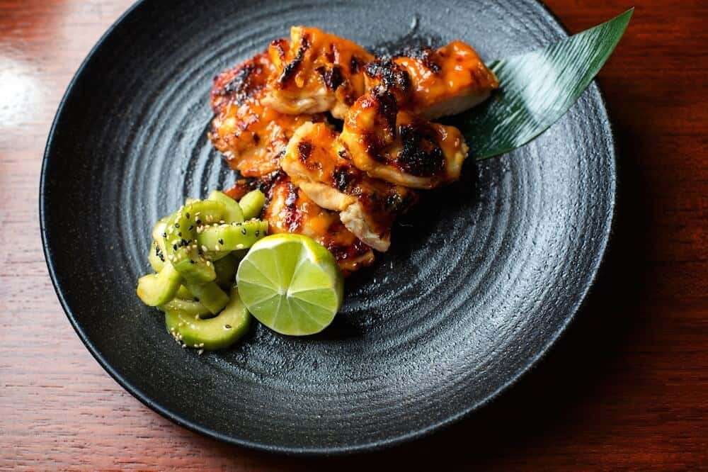 - Take some of the fresh cucumber pickles and arrange next to the chicken. You can also add a slice of lime as shown in the picture, a squeeze of the lime on the chicken will lift it into bliss.