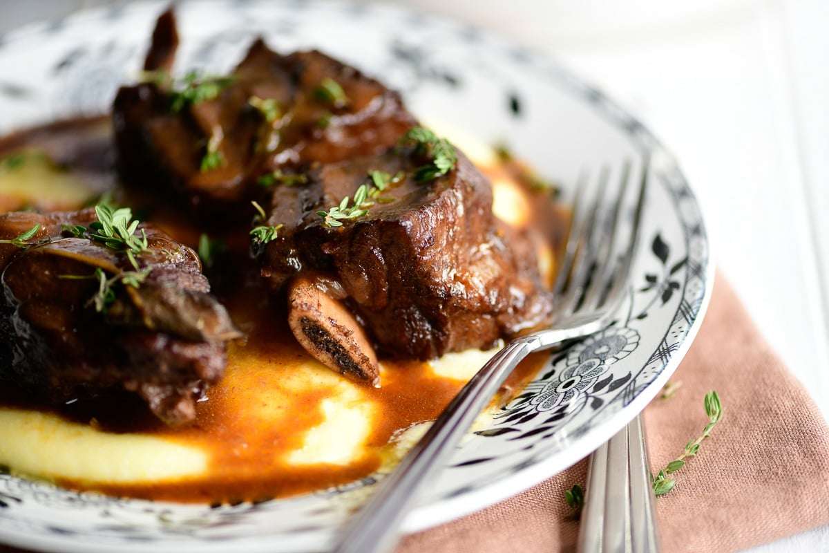 - Serve the ribs, 2 per serving, on top of hot polenta and ladle with gravy. Garnish with fresh thyme (or parsley.) Tip: the gravy should be thin, but if you'd like it thicker, just boil it down in a saucepan until it reaches your desired thickness.