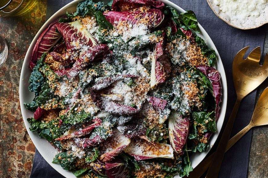 - Pour the dressing over the kale and Treviso and toss well to thoroughly combine. Taste and adjust seasoning to taste. Let the salad sit for about 5 minutes until the kale starts to soften. Top with the toasted breadcrumbs tossed with butter and more shredded pecorino cheese.