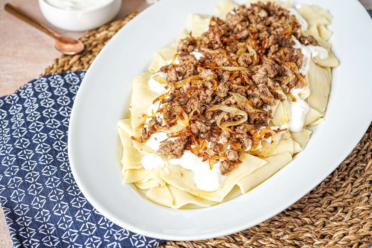 - Drizzle melted butter over the pasta, followed by the garlic yogurt (or keep in a bowl on the side to add individually). Top with the meat and onion mixture and serve immediately.