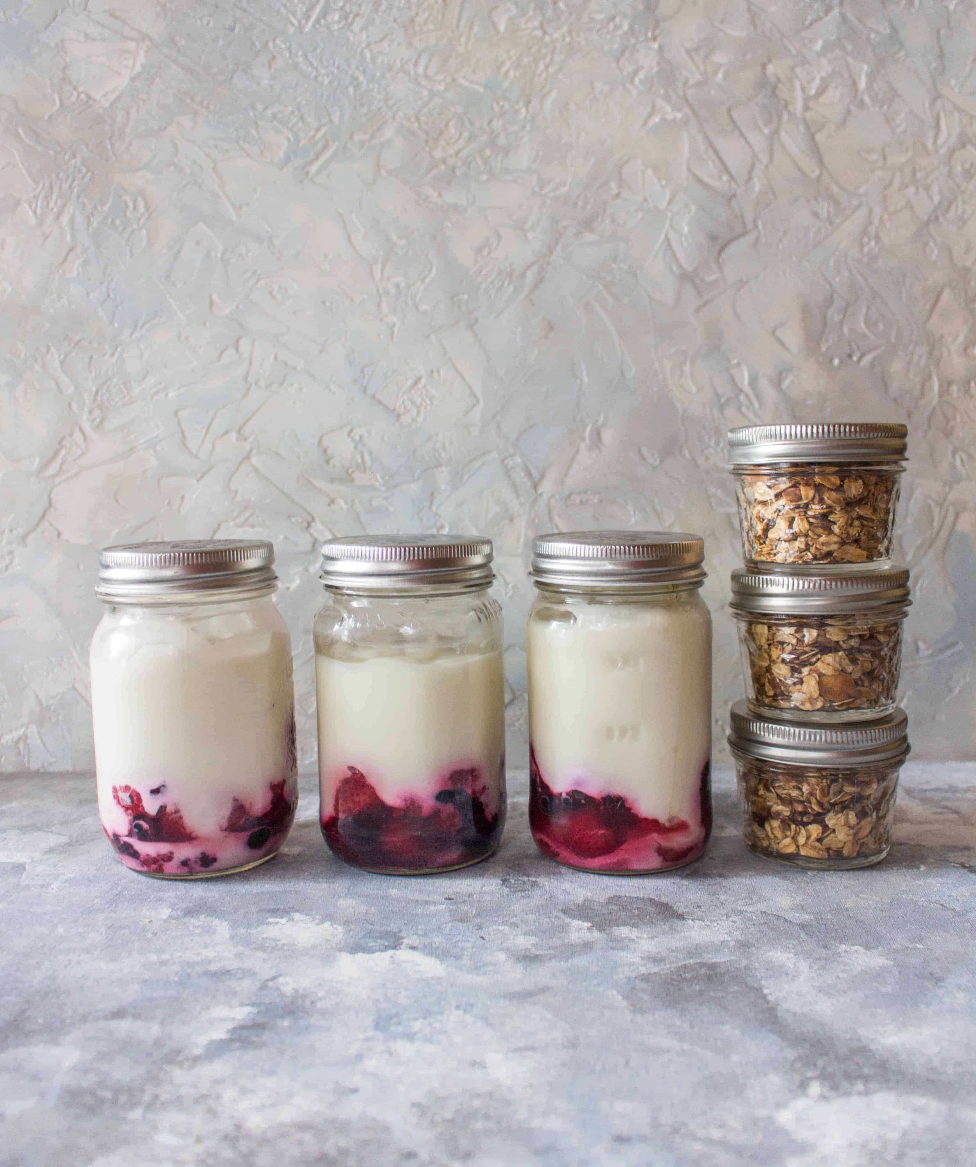 - Layer in a mason jar the fruit and then the yogurt. Optional to add the granola in at this step or keep it separate in a different mason jar to prevent it from getting soggy.