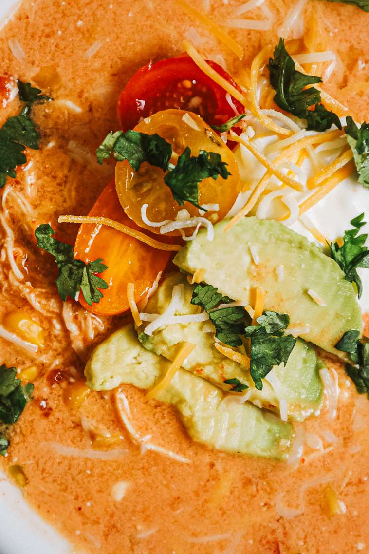 - SLOW COOKER: Place all ingredients into your slow cooker and cook on low for 6 hours, or high for about 4 hours. Shred chicken and whisk cream cheese to blend into soup fully. Serve in bowls with desired toppings.