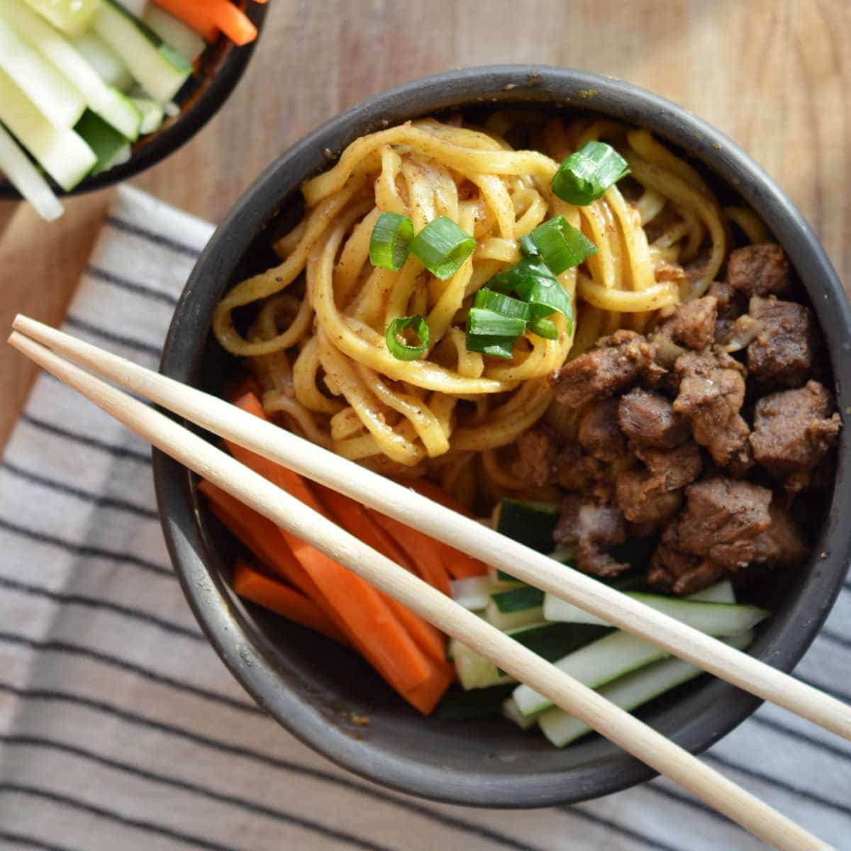 Le zhajiangmian est un plat chinois de nouilles de blé nappées de sauce zhajiang et accompagnées de porc et de garnitures végétales.
