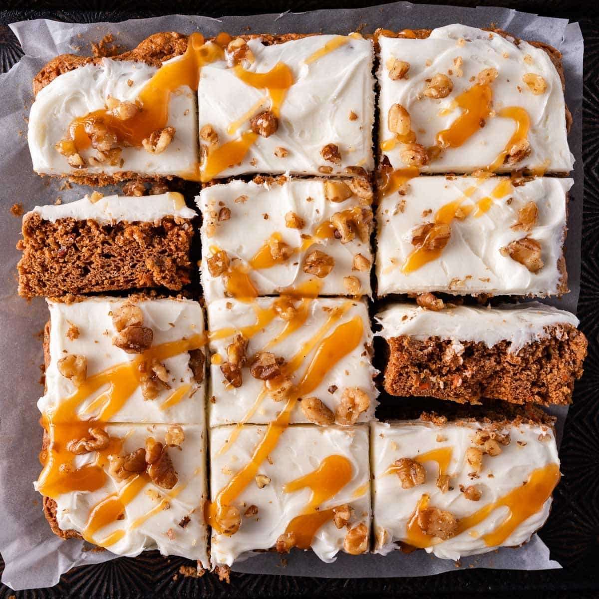 - Once the bars are cool, frost the bars with cream cheese frosting. Then drizzle with caramel and sprinkle with walnuts. 12 ounces cream cheese frosting, 3 tablespoons caramel sauce, 1/4 cup chopped walnuts