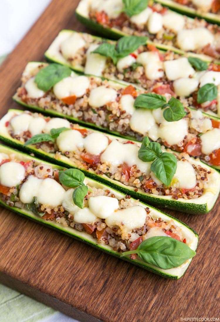 A simple filling of quinoa, pico de gallo and melted mozzarella cheese makes these quinoa stuffed zucchini boats a delicious, super easy vegetarian meal to share!